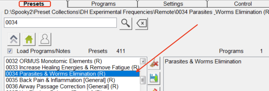 - 0034 Parasites & Worms Elimination (R) (DH Experimental) — un preset molto apprezzato e raccomandato nei gruppi utenti di Spooky2.