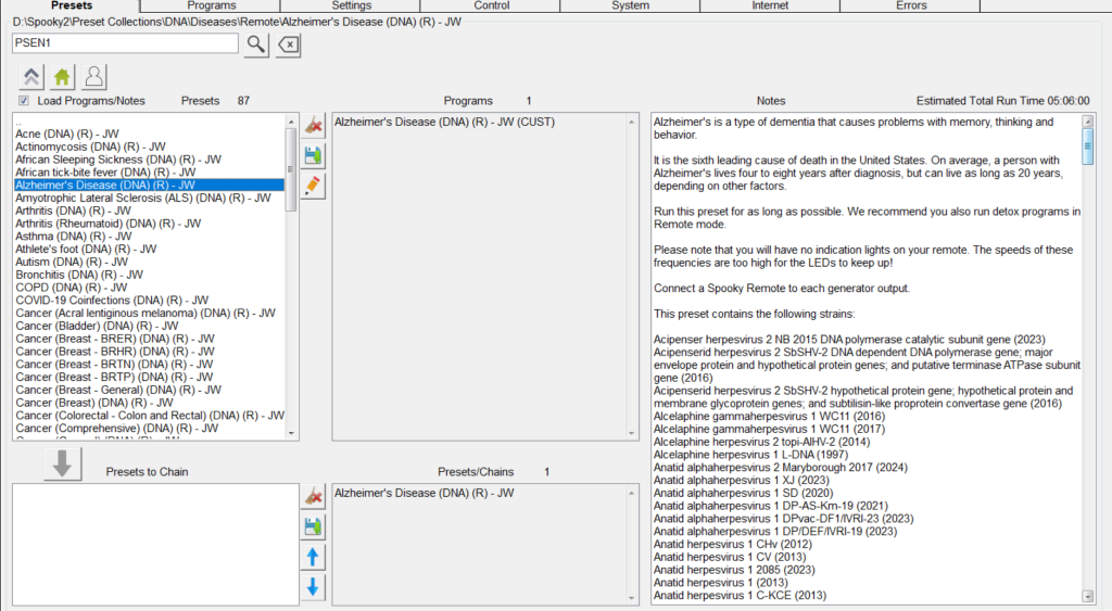 I programmi che utilizzano le frequenze del DNA di Spooky2 mirano alla base genetica e molecolare delle malattie neurodegenerative. L’idea alla base delle frequenze del DNA è che ogni gene e proteina possieda una frequenza vibratoria unica, che può essere modulata per supportare o correggere i processi naturali del corpo. Mirando alle frequenze specifiche di geni come PSEN1, ApoE4 o α-Sinucleina, Spooky2 contribuisce a modulare la progressione della malattia attraverso: