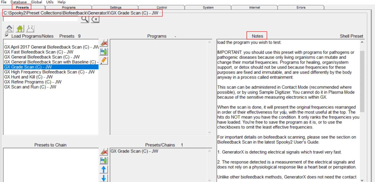 Puoi trovare maggiori dettagli nella sezione note di questo preset di scansione. Apri il software Spooky2, vai alla scheda Preset e scegli Biofeedback. Quindi fare clic su GeneratorX e selezionare GX Grade Scan. Quindi, vedrai le note per questo tipo di scansione.
