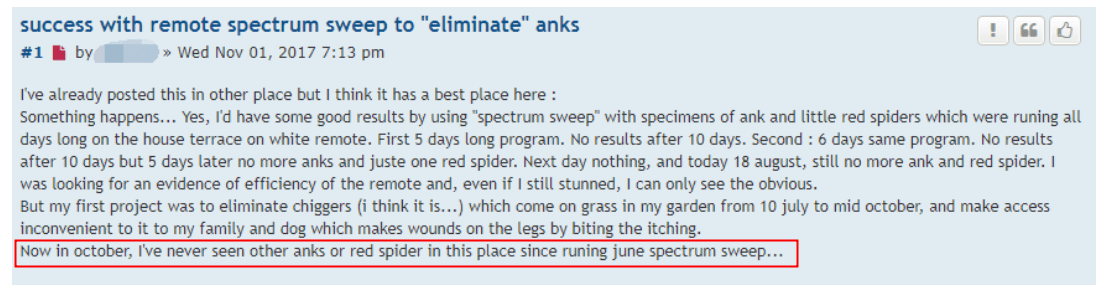 L’ho già postato su un’altra pagina, ma penso che questo sia il posto migliore: Succede qualcosa… Sì, ho ottenuto dei buoni risultati usando lo “spectrum sweep” con esemplari di formiche e ragnetti rossi che correvano tutti i giorni sulla terrazza di casa. Con il primo programma di 5 giorni non ho avuto nessun risultato dopo 10 giorni. Secondo programma: 6 giorni con lo stesso programma, ma ancora nessun risultato dopo 10 giorni. Tuttavia, dopo 5 giorni non c’erano più formiche e solo un ragno rosso. Il giorno successivo nessun insetto e oggi, 18 agosto, sono ancora senza formiche e ragni rossi. Ho cercato una prova sull’efficienza del remoto e, anche se sono ancora sbalordito, vedo solo l’evidenza. Ma il mio primo obiettivo è stato quello di eliminare gli acari (credo che si chiamino così … ) che infestano il prato del mio giardino dal 10 luglio a metà ottobre, rendendo l’accesso al giardino disagevole , sia per la mia famiglia che per il cane che si ferisce mordendosi le punture a causa del prurito. Ora, ad ottobre, da quando ho eseguito la scansione dello spettro di giugno, non ci sono più formiche o ragni rossi in casa… ”