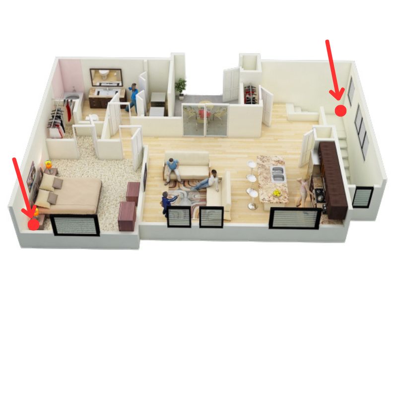 Posiziona le scatole Scalar negli angoli selezionati della casa e collegali con il cavo di collegamento. (Per una casa a due piani, puoi posizionare una scatola al piano inferiore e l’altra al piano superiore.)