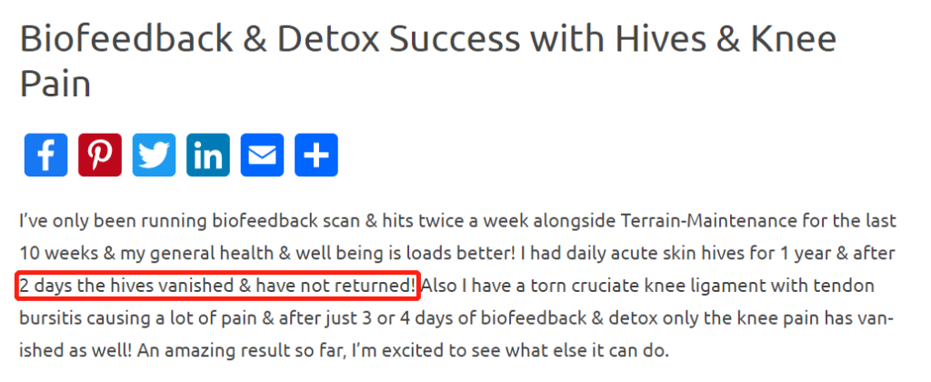 Successo di biofeedback e disintossicazione con orticaria e dolore al ginocchio.