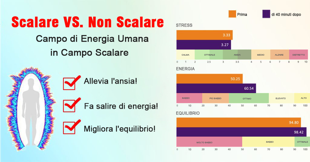 Abbiamo effettuato un esperimento analizzando i cambiamenti del campo energetico umano nel campo scalare puro. Abbiamo posizionato cinque persone all’interno dei dispositivi che generano il campo scalare per 40 minuti e abbiamo misurato il campo energetico, prima e dopo il trattamento per analizzare la loro condizione di omeostasi energetica. Tutti i risultati hanno mostrato che il loro livello energetico è stato notevolmente migliorato, mostrando uno stato ben equilibrato. Inoltre, i soggetti dello studio hanno notevolmente migliorato gli stati d’ansia.