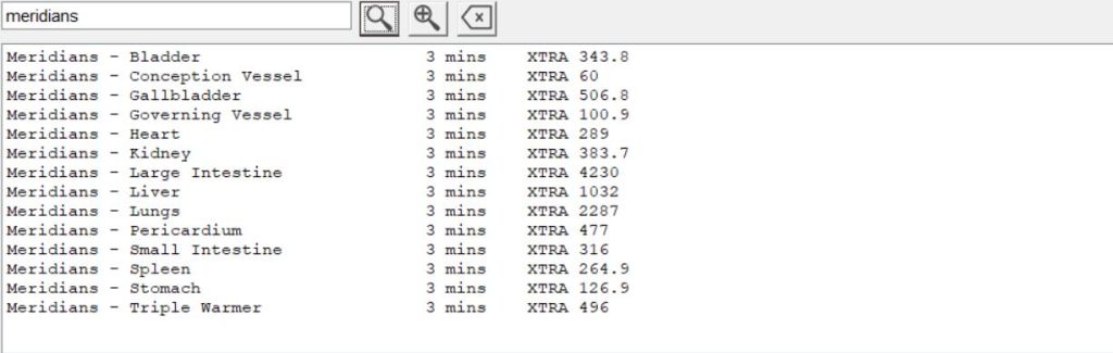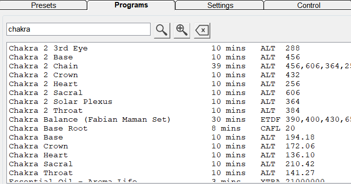 Controlla il software Spooky2, sotto Shell (Empty) Presets\Scalar, fai clic su Spooky2 Scalar General (SS) –JW, vai alla scheda programmi e cerca “chakra, meridiani e nadi”. Di seguito sono riportate le frequenze che è possibile eseguire utilizzando Spooky2 Scalar.