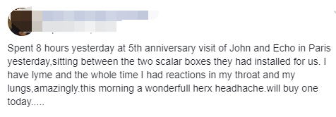 Uno dei nostri utenti, che ha la malattia di Lyme da molto tempo, ha detto che quando si trovava in campo scalare, sentiva delle reazioni alla gola e ai polmoni.