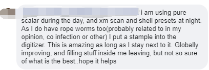 Sto usando scalare puro durante il giorno e la scansione xm e i preset di shell di notte. Dato che ho anche i vermi della corda (probabilmente legati a mia opinione, coinfezione o altro) ho messo un testimone nel digitalizzatore. Questo è incredibile finché rimango accanto ad esso. Globalmente migliorando e riempiendo le cose dentro di me che me ne vado, ma non sono così sicuro di quale sia il migliore..Spero che sia d’aiuto.