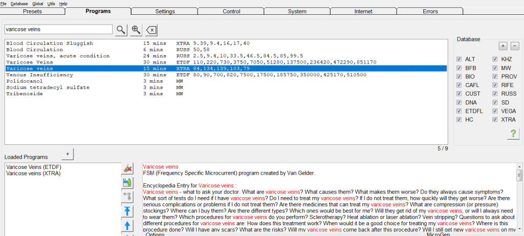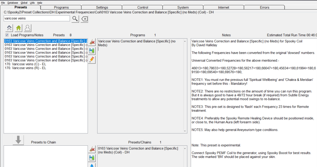 I preset sperimentali DH sono molto popolari tra gli utenti di Spooky2 e nel database è possibile cercare “vene varicose” nella scheda Preset e verrà visualizzato il preset DH per le vene varicose.