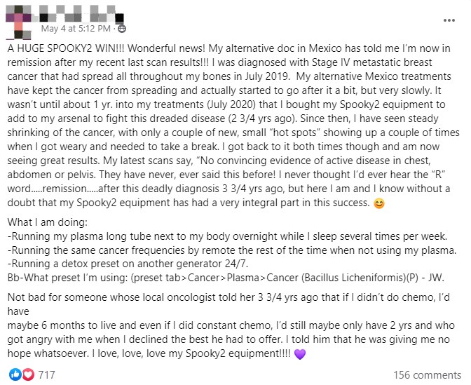 “UN ENORME SPOOKY2 VINCE!! Notizie meravigliose! Il mio medico di medicina alternativa in Messico mi ha detto che ora sono in remissione dopo i risultati dell’ultima scansione!! Mi era stato diagnosticato un carcinoma mammario metastatico allo stadio IV che si era diffuso in tutte le mie ossa nel luglio 2019. I miei trattamenti con approcci alternativi, in Messico, avevano impedito al cancro di diffondersi un po’, ma molto lentamente. È stato solo dopo circa 1 anno dall’inizio di questi trattamenti (luglio 2020) che ho acquistato Spooky2 da “aggiungere” al mio arsenale per contrastare questa temuta malattia (2 anni e 3/4 fa). Da allora, ho visto una costante riduzione del cancro, con solo un paio di nuovi, piccoli “punti caldi” che si sono presentati un paio di volte quando mi sono stancato e ho avuto bisogno di fare una pausa dal trattamento con Spooky2. Riprendendo entrambe le volte ora sto vedendo ottimi risultati.