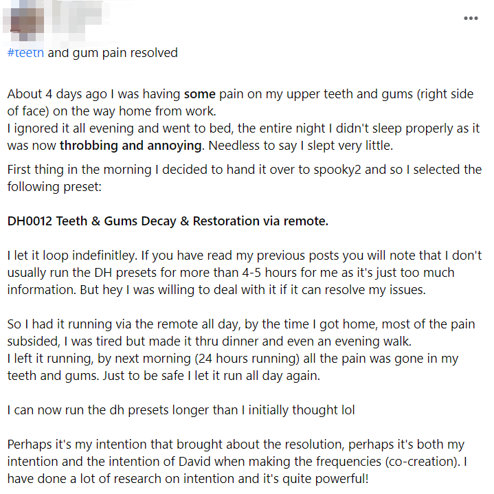 La prima cosa che ho fatto la mattina dopo è stata di passarlo a Spooky2 e quindi ho selezionato il seguente preset: DH0012 Teeth & Gums Decay & Restoration tramite remoto.