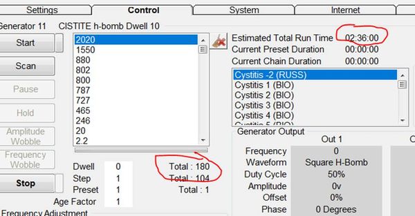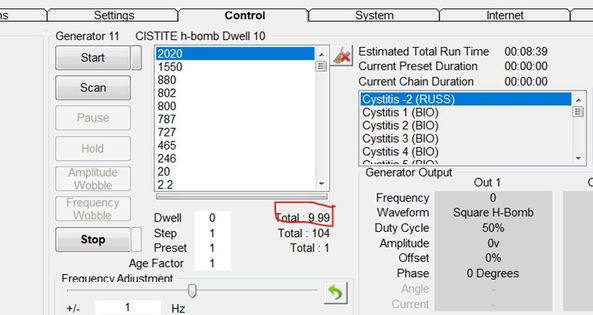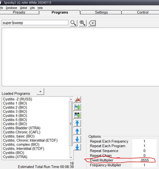 Procedura: ho cercato nella scheda Programmi inserendo “Cistite” e ho selezionato tutti i programmi trovati (in totale 18 volte, totale 2:36:00). Nella scheda programma ho modificato il campo Dwell Multiplier inserendo il numero o,o555 al posto del valore 1 (1/18 di 180 sec -Dwell-utilizzato per attivare moralmente la singola frequenza); riducendo così il Dwell previsto a 9,99 (Vedi scheda di controllo) e il tempo totale a 08 min 39 sec.