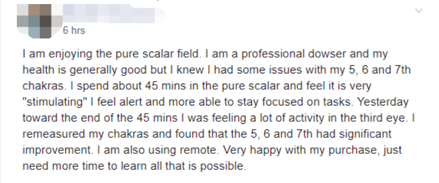 Sto godendo del campo scalare puro. Sono un radiestesista professionista e la mia salute è generalmente buona, ma sapevo di avere alcuni problemi con il 5°, 6° e 7° chakra. Passo circa 45 minuti nel campo scalare puro e sento che è molto stimolante, mi sento sveglio e più in grado di rimanere concentrato sui compiti. Ieri, verso la fine dei 45 minuti, sentivo molta attività nel terzo occhio. Ho misurato nuovamente i miei chakra e ho trovato un miglioramento significativo nel 5°, 6° e 7°. Sto anche usando il remoto. Sono molto contento del mio acquisto, ho solo bisogno di più tempo per imparare tutto ciò che è possibile.