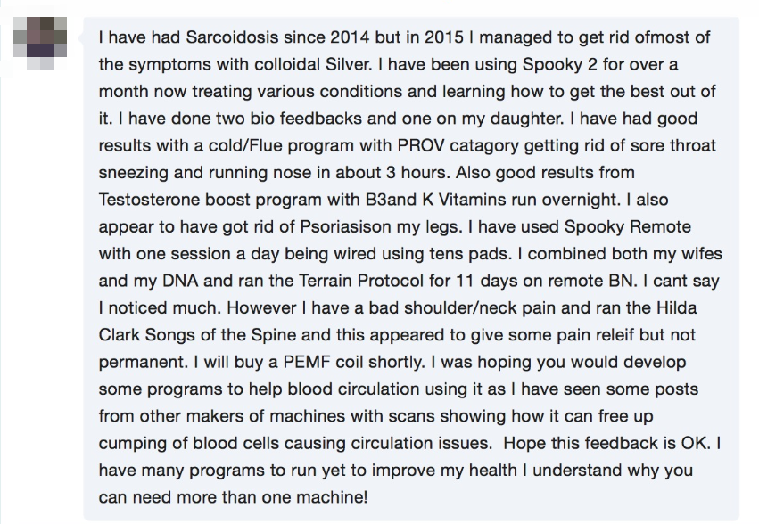 Soffro di sarcoidosi dal 2014 ma nel 2015 sono riuscita a sbarazzarmi della maggior parte dei sintomi con l’argento colloidale. Sto usando Spooky 2 da oltre un mese per trattare varie condizioni e imparare come ottenere il meglio da esso.