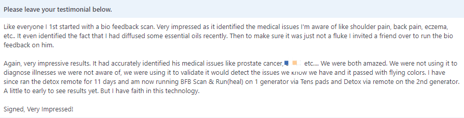 Ancora una volta, risultati davvero impressionanti. Aveva identificato con precisione i suoi problemi di salute come il cancro alla prostata, ecc. Eravamo entrambi stupiti. Non lo stavamo usando per diagnosticare malattie di cui non eravamo consapevoli, lo stavamo usando per verificare che avrebbe rilevato i problemi che sappiamo di avere e lo abbiamo superato a pieni voti. Da allora ho eseguito il protocollo di disintossicazione (detox) per 11 giorni e ora sto eseguendo BFB Scan & Run (heal) su 1 generatore tramite Tens pad e Detox tramite telecomando sul 2 ° generatore. Un po’ troppo presto per vedere ancora i risultati. Ma ho fiducia in questa tecnologia.