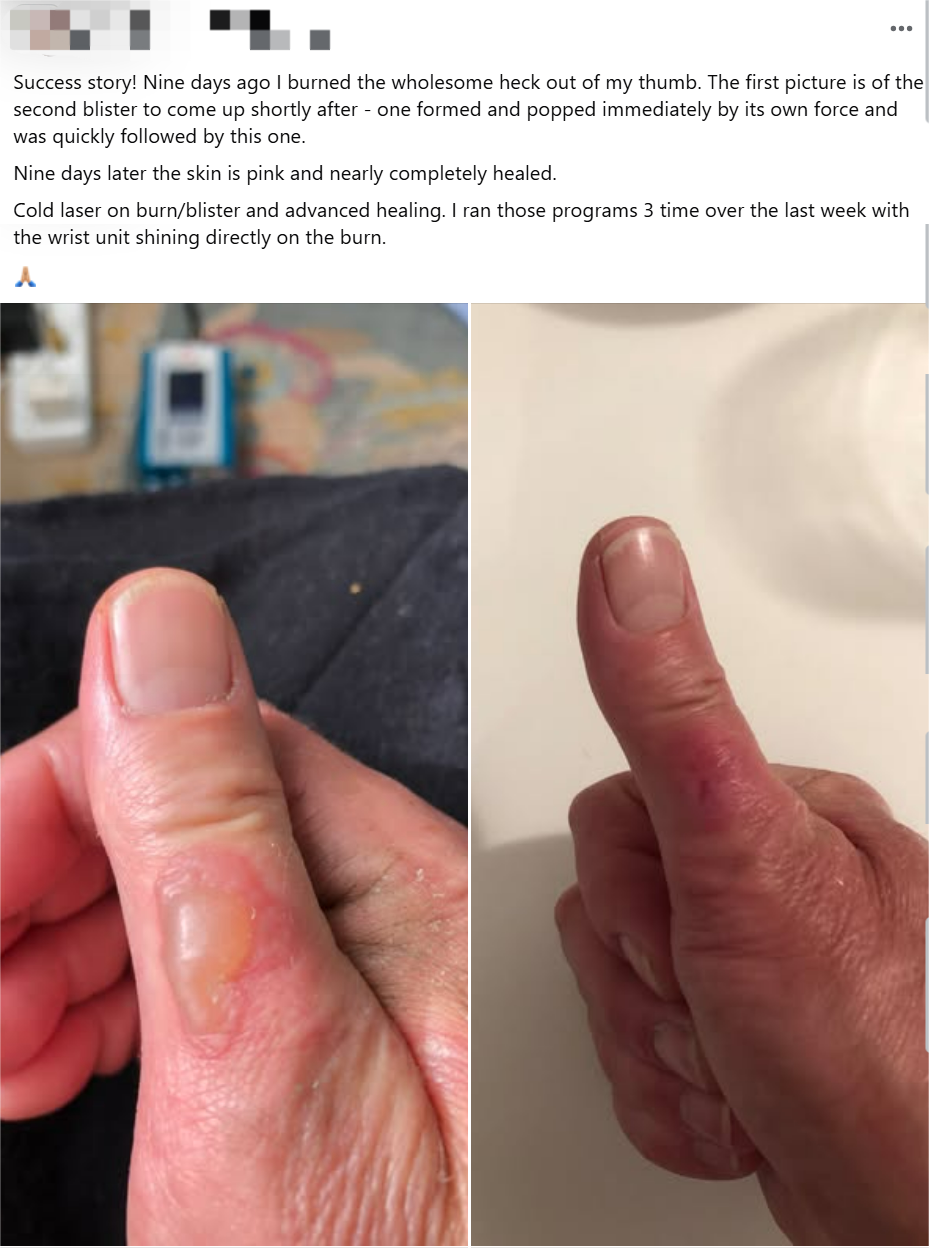 Laser freddo sulla bruciatura/vescica e guarigione avanzata. Ho eseguito quei programmi 3 volte nell’ultima settimana con l’unita da polso che illuminava direttamente la bruciatura.