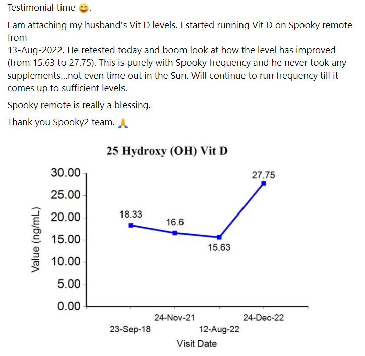 Allego i livelli di vitamina D di mio marito. Ho iniziato a usare la vitamina D sul remoto dello Spooky2 dal 13/08/2022. Ha ripetuto il test oggi e boom guarda come il livello è migliorato da 15,63 a 27,75). Questo è stato puramente con la frequenza Spooky2 e non ha mai preso integratori… nemmeno un momento al sole. Continuerò a usare la frequenza finché non raggiungerà livelli sufficienti. Lo Spooky2 remote è davvero una benedizione.