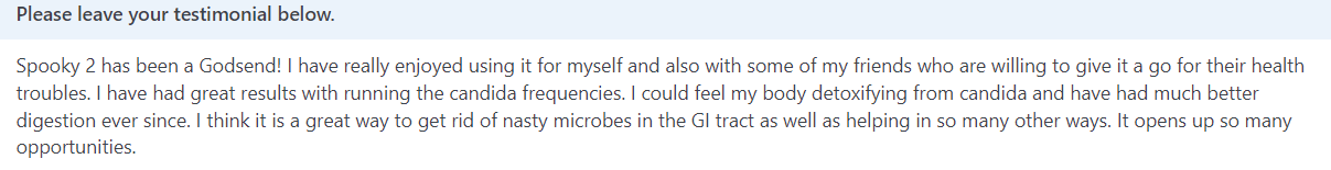 Mi è piaciuto molto usarlo per me stesso e anche con alcuni dei miei amici che sono disposti a provarlo per i loro problemi di salute. Ho avuto ottimi risultati con l’esecuzione delle frequenze della candida. Potevo sentire il mio corpo disintossicarsi dalla candida e da allora ho avuto una digestione molto migliore. Penso che sia un ottimo modo per sbarazzarsi dei microbi cattivi nel tratto gastrointestinale, oltre ad aiutare in tanti altri modi. Apre così tante opportunità.