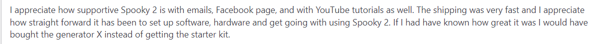 Apprezzo molto il supporto offerto da Spooky2 tramite le email, la pagina Facebook e anche i tutorial su YouTube. La spedizione è stata molto veloce e ho apprezzato quanto sia stato semplice configurare il software, l’hardware e iniziare a usare Spooky2. Se avessi saputo quanto fosse valido, avrei acquistato direttamente il Generator X Pro invece del kit Spooky2 Starter Portatile.