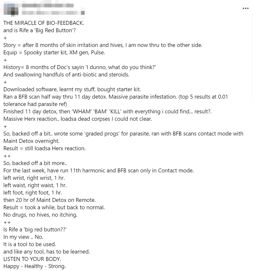 Quindi, ho fatto un po’ marcia indietro… ha eseguito alcuni ‘programmi graduati’ per il parassita, ha eseguito le scansioni BFB in modalità di contatto con Detox di mantenimento durante la notte.