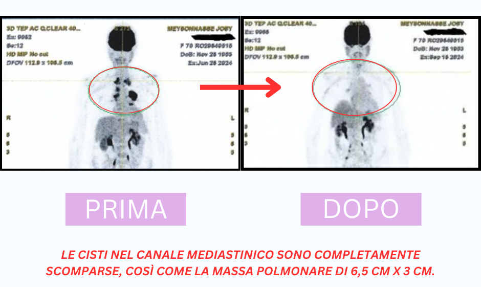 Le cisti nel canale mediastinico sono completamente scomparse, così come la massa polmonare di 6,5 cm x 3 cm.
