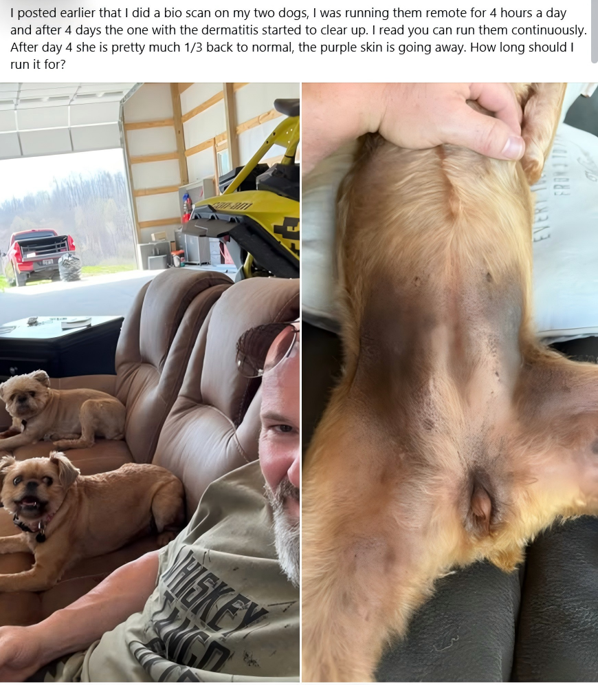 Ho scritto prima che avevo fatto una bio-scan sui miei due cani. Li stavo trattando in modalità Remote per 4 ore al giorno e, dopo 4 giorni, quello con la dermatite ha iniziato a migliorare.