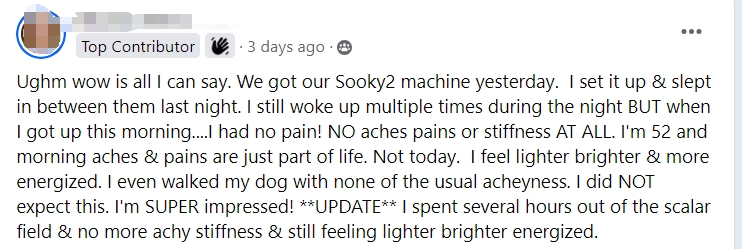 Uhm… wow, è tutto ciò che posso dire. Abbiamo ricevuto la nostra macchina Spooky2 ieri. L’ho configurata e ho dormito tra le unità stanotte. Mi sono comunque svegliata più volte durante la notte, MA quando mi sono alzata questa mattina… non avevo alcun dolore! Nessun dolore, nessuna rigidità, nessun fastidio.
