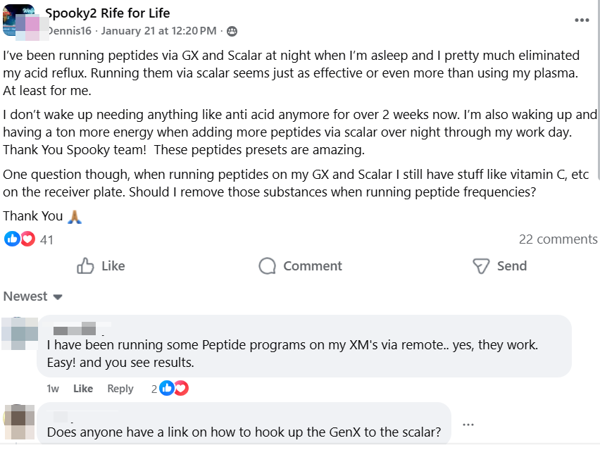 “Sto utilizzando i peptidi tramite GX Pro e Scalar durante la notte, mentre dormo, e ho praticamente eliminato il mio reflusso acido. L’esecuzione in modalità scalar sembra altrettanto efficace, se non più efficace, rispetto all’uso del plasma—almeno per me.