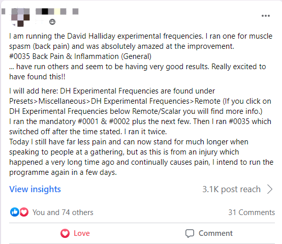 Sto eseguendo le frequenze sperimentali di David Halliday. Ne ho eseguito uno per spasmi muscolari (mal di schiena) e sono rimasto assolutamente stupito dal miglioramento.