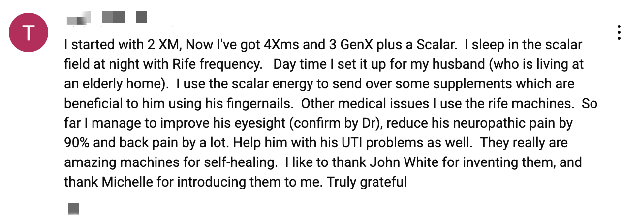 Ho iniziato con 2XM, ora ho 4Xms e 3 GenX più uno Scalar. Dormo nel campo scalare di notte con frequenza Rife. Di giorno l’ho allestito per mio marito (che vive in una casa di riposo). Uso l’energia scalare per inviargli alcuni integratori che sono utili per lui usando le unghie. Per altri problemi medici utilizzo le macchine Rife. Finora sono riuscito a migliorare la sua vista (con conferma da parte del dottore), a ridurre il suo dolore neuropatico del 90% e il mal di schiena di molto. Il trattamento ha migliorato anche i suoi problemi di infezione delle vie urinarie. Sono davvero macchine straordinarie per l’autoguarigione. Vorrei ringraziare John White per averli inventati e ringraziare Michelle per avermeli presentati. Veramente grato!