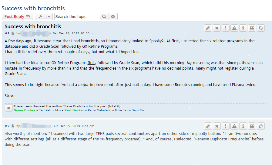 Qualche giorno fa, è diventato chiaro che avevo la bronchite, quindi ho subito cercato sullo Spooky2. Inizialmente, ho selezionato i sei programmi correlati nel database e ho eseguito una scansione di grado seguita da programmi GX Refine.