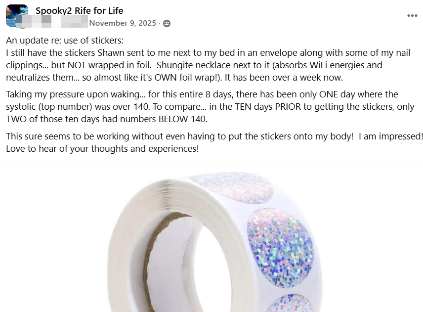 Ho ancora gli adesivi che Shawn mi ha inviato accanto al mio letto, in una busta insieme ad alcune delle mie unghie tagliate… ma NON avvolti nella carta stagnola. Accanto c’è la collana di shungite (assorbe le energie del WiFi e le neutralizza… quindi quasi come se fosse una sua “copertura in stagnola”!). È passato più di una settimana.