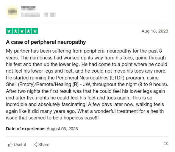 Ha iniziato a eseguire il programma Peripheral Neuropathies (ETDF), utilizzando Shell (Empty)/Remote/Healing (R) – JW, durante la notte (per 8-9 ore). Dopo due notti, il primo risultato è stato che ha cominciato a sentire di nuovo le sue gambe inferiori e dopo cinque notti ha cominciato a sentire i piedi e le dita dei piedi. È incredibile e assolutamente affascinante!