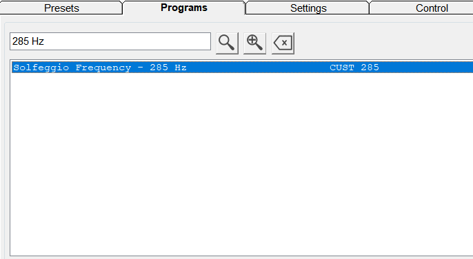Nella scheda “Presets”, sotto Shell (Empty) Presets\Scalar, seleziona Spooky Scalar General (SS) – JW, quindi cerca “285 Hz” nella scheda “Programs”. Fai doppio clic sul programma evidenziato.