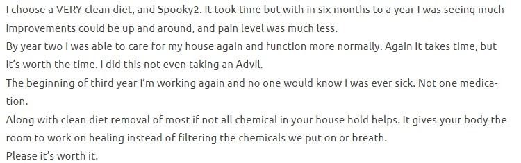 “Ho scelto una dieta MOLTO pulita e lo Spooky2. Ci è voluto del tempo, ma nel giro di sei mesi o un anno ho visto molti miglioramenti e il livello di dolore era molto inferiore.